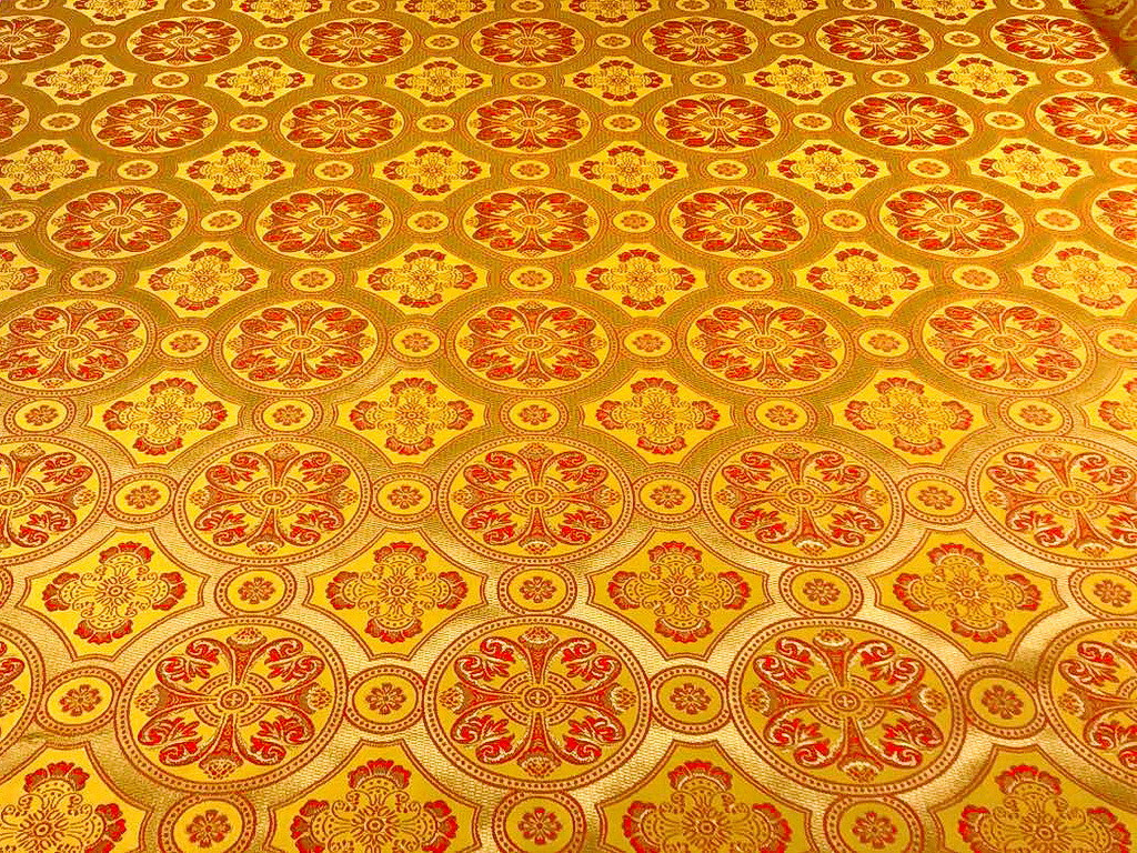 Шовкова тканина церковної тематики - Візантія жовта з червоним контуром з золотом.